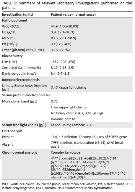 Poor prognostic factors in primary PCL include both clinical and laboratory parameters.6,7 Of these, the case study patient presented with a performance status score of 2, an absolute peripheral blood plasma cell count of > 4 × 109/L, thrombocytopenia, diffuse marrow infiltration, specific cytogenetic abnormalities, including a complex karyotype, elevated lactate dehydrogenase, elevated β2 microglobulin and hypercalcaemia. Induction therapy failed to induce remission.
