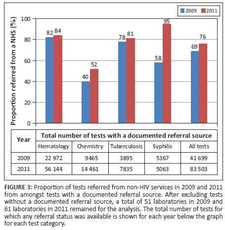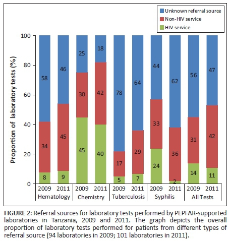 OBJECTIVES: We aimed to describe the number and proportion of laboratory tests performed in 2009 and 2011 for patients referred from HIV and non-HIV services (NHSs) in a convenience sample collected from 127 laboratories supported by PEPFAR in Tanzania. We then compared changes in the proportions of tests performed for patients referred from NHSs in 2009 vs 2011.