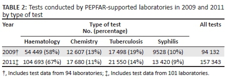 This study has several limitations. Firstly, the data comprised a non-random convenience sample of laboratories. Thus, the results may not be generalisable to other PEPFAR-supported laboratories in Tanzania or in other PEPFAR-supported countries. It is also unknown, in the absence of a comparison group, whether the volume of laboratory tests referred from HIV services and NHSs would have changed in the absence of PEPFAR or at comparable public laboratories not supported by PEPFAR. Secondly, it would have been advantageous to describe the change in laboratory tests over a longer period. However, this was not feasible, as ICAP support for most study laboratories began in 2009. Thirdly, because the sources of the laboratory data did not record identifiable patient information, the unit of analysis in this study was a laboratory test and not an individual patient, who could have had multiple tests. As stated previously, the HIV status of the patient for whom each test was performed was unknown. Future analyses evaluating utilisation of laboratory services at the patient level would provide additional information as to whether there are differences in laboratory usage according to patients' HIV status. Fourthly, our data did not include information on the reason for a test being ordered for samples referred from NHSs. Thus, we could draw no conclusions as to whether or how guidelines for laboratory testing amongst non-HIV patients influenced utilisation of laboratory services. Finally, we were limited by the availability of hard-copy laboratory registers. The absence of a register did not necessarily mean that tests were not performed in a given laboratory, but merely that we were unable to access documentation of the test being performed. Even when registers were available, only 54% (51/94) of laboratories in 2009 and 61% (61/101) of laboratories in 2011 recorded referral sources; amongst those that did, we could not verify the referral source against other records. However, data availability and quality are unlikely to have changed notably over the study period.