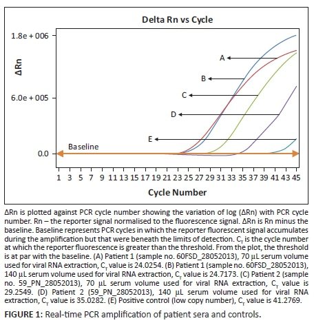 The gel-based RT-PCR flavivirus tests for Yellow fever and Dengue fever (types 1-4), as well as the real-time RT-PCR filovirus test for Marburg and Ebola, were negative (Table 3). However, the RT-PCR amplification of the S-gene segment of arenaviruses detected a 320 bp DNA band in the well with the patients' clinical specimens. The length and position of these bands were on a par with the positive Lassa virus control (an inactivated culture supernatant of cells infected with Lassa virus strain CSF); no band was observed in the negative control (PCR-grade water) well. The real-time RT-PCR amplification of the S-gene segment of the arenavirus test produced a clear peak with a sigmoid-shaped curve for the patient's samples, whereas no peak was observed for the negative control, which in the figure is covered by the threshold line, or baseline (Figure 1). This two-result signal indicated the presence of Lassa virus in the patients' sera. The samples from the five asymptomatic close contacts were tested in the same assay run and no indication of the presence of Lassa virus was observed (data not shown).