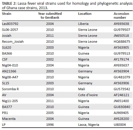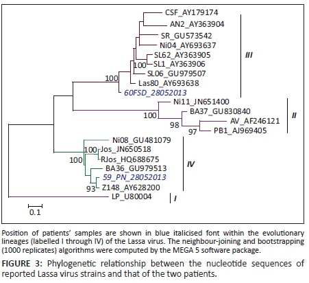 The phylogenetic analysis with GenBank data revealed that the nucleotide sequences from the patients had close phylogenetic relationships with the reported Lassa virus strains Macenta20 (GenBank accession number: AY628200) and las80379214 (GenBank accession number: AY693638) (Figure 3). The sequence data from the patient who died (Patient 1, sample no. 60FSD_28052013) was sent to GenBank and assigned accession number KF425246.