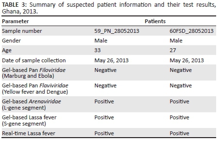 The index case was a male soldier with severe symptoms of malaria who died on May 11, after admission to a Level II hospital for about a week. Two male colleagues, aged 27 years (Patient 1) and 33 years (Patient 2), who were living in the same camp, subsequently developed severe fever and myalgia on May 15 (Patient 1) and 21 (Patient 2). Their medical conditions deteriorated, necessitating their medical evacuation to the 37 Military Hospital, a Level IV facility, in Accra, Ghana, on May 26, 2013 after five days of illness for Patient 1 and 11 days for Patient 2. Patient 1 died two days after admission. At the military hospital in Accra, the medical staff ruled out malaria through microscopic examination of thick and thin blood smears and focused on the clinical manifestations, which were classified as VHF. A presumptive clinical diagnosis of Lassa fever was made on the strength of previous outbreaks of Lassa fever in Liberia.10 To investigate these clinical suspicions, blood samples from the patients and five asymptomatic close contacts were analysed.