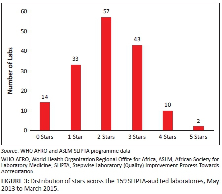 Generally, at the time of the audits, most of the laboratories had not surpassed the 3-star rating and only two laboratories had achieved five stars. This implies that although the SLIPTA process has been widely accepted by most countries and notable improvements made, the majority of laboratories have yet to reach international accreditation readiness. To reach their goals, country strategic planning with committed resources for infrastructure, human resources and training in laboratory quality improvement and structured laboratory mentoring are all part of continuous quality improvement and accreditation preparedness.