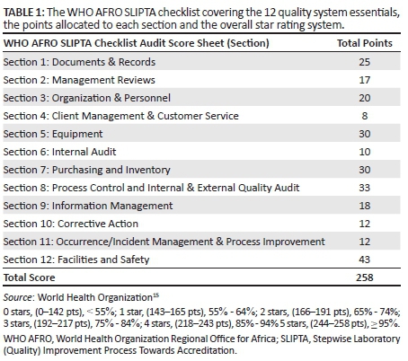 The scoring checklist allows for laboratory performance to be rated using a scale of 0 to 5 stars with each star level associated with the laboratory's total score on the audit as follows: 0-142 points = 0 stars, 143-165 points = 1 star, 166-191 points = 2 stars; 192-217 points = 3 stars, 218-243 points = 4 stars and 244-258 points = 5 stars. At the end of the audit, each laboratory that achieves a star level of one star or higher is issued a corresponding star level certificate that is valid for two years (Table 1). Progress up the star scale denotes increased compliance with the WHO AFRO SLIPTA checklist aligned with international standards.