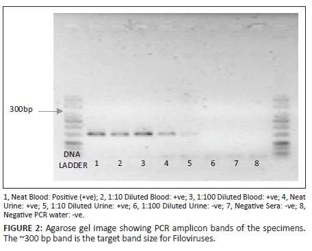 Investigations carried out on viral RNA purified from the blood and urine specimens of the patient revealed the presence of the expected amplicon size (300 bp) for Filoviruses (Figure 2). However, no signals were observed for Lassa or Dengue fever viruses. The filovirus amplicons were still detected in blood specimens with logscale dilutions of 1 (1:10) and 2 (1:100), whereas in urine samples the signal was no longer detectable at a log 3 dilution.