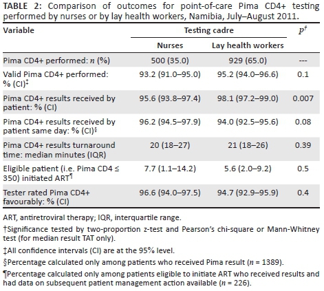 RESULTS: Overall, 1429 patients received a Pima CD4+ test; 500 (35.0%) tests were performed by nurses and 929 (65.0%) were performed by lay health workers. When Pima CD4+ testing was performed by a nurse or a lay health worker, 93.2% and 95.2% of results were valid (p = 0.1); 95.6% and 98.1% of results were received by the patient (p = 0.007); 96.2% and 94.0% of results were received by the patient on the same day (p = 0.08). Overall, 97.2% of Pima CD4+ results were received by patients, compared to 55.4% of standard laboratory CD4+ results (p < 0.001
