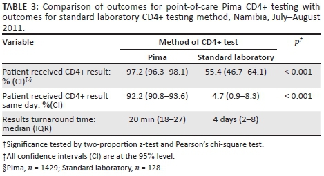METHODS: From July to August 2011, Pima CD4+ analysers were used to improve access to CD4+ testing at 10 selected public health facilities in Namibia. POC Pima CD4+ testing was performed by nurses or lay health workers. Venous blood samples were collected from 10% of patients and sent to centralised laboratories for CD4+ testing with standard methods. Outcomes for POC Pima CD4+ testing and patient receipt of results were compared between nurses and lay health workers and between the POC method and standard laboratory CD4+ testing methods