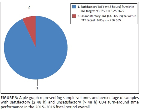 Figure 3 reveals that 93.2% of CD4 samples had a TAT ≤ 48 h, that is satisfactory TAT. There were 236 555 (6.8%) samples with a TAT > 48 h, meaning unsatisfactory TAT.