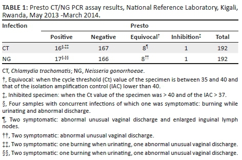 OBJECTIVES: The objective of the study was to implement and evaluate the Presto CT/NG PCR assay at the National Reference Laboratory (NRL) in Kigali, Rwanda, where no real-time PCR assays for the detection of C. trachomatis or N. gonorrhoeae were available.