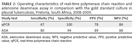 Molecular diagnostic tests such as qPCR have been used in the diagnosis of tuberculosis. However, the sensitivity of qPCR varies, because different methods target different genes such as rpoB, 16s rRNA and IS6110.6,9 Advantages of qPCR over conventional PCR (polymerase chain reaction)testing include fast availability of results, decreased risk of contamination and quantification of bacterial load.10 It is important to find a rapid and reliable test for the diagnosis of pleural tuberculosis, particularly in developing countries such as South Africa where there is high incidence of tuberculosis and HIV. Although the utility of ADA and qPCR for the diagnosis of pleural tuberculosis has been reported worldwide, there is a need to evaluate these tests in developing countries with a high tuberculosis burden.11 This study evaluated the use of ADA and qPCR for the diagnosis of pleural tuberculosis.