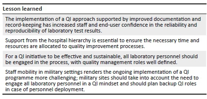 Several important factors can explain the successes achieved during the QI programme. The laboratory leadership and staff benefited from the strong support of the hospital management, thus underpinning laboratory staff motivation to sustain quality improvements. Also, the implementing partner provided support in the execution of work plans, drafting of procedures, funding of training visits and organisation of regular teleconferences to track progress. The implementing partner provided sound advice for the appropriation of the quality approach and the implementation of improvement steps.