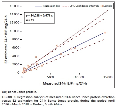 Despite new therapy options, MM is largely incurable, and most patients relapse and require a change in management. Laboratory testing plays a vital role in monitoring response to treatment as well as detecting a relapsed inpatient on treatment.9 This, together with the previously described issues related to 24-h urine collections, prompted us to examine the utility and validity of measured 24-h urine compared to random urine collections for the quantitation of BJP in a South African population.
