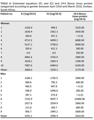 The correlation between E2 and the 24-h BJP is 0.88 for women and 0.988 for men. The E2 equation was based on the average urinary creatinine excretion which is higher in men (14 mg/kg - 26 mg/kg per day) than women (11 mg/kg - 20 mg/kg per day). The correlation between E1 which is based on creatinine excretion and 24-h BJP is 0.82 for women and 0.975 for men (Table 4).