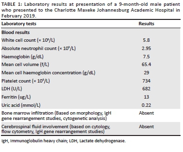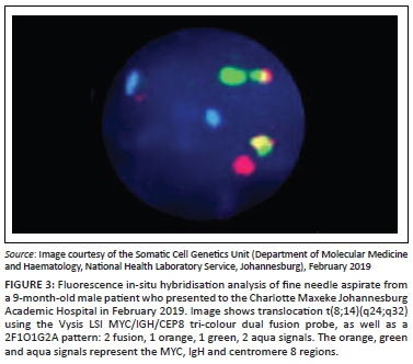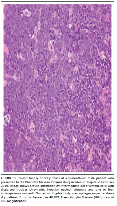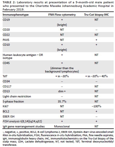 CASE PRESENTATION: We report a case from February 2019 at the Charlotte Maxeke Johannesburg Academic Hospital, South Africa, of a 9-month-old infant with a predominantly extracranial soft tissue mass showing extradural extension. There was no involvement of the peripheral blood or bone marrow. Fine needle aspiration and Tru-Cut biopsy of the soft tissue scalp mass showed the tumour to be of precursor B-cell phenotype. Contrastingly, an immunophenotypic assessment revealed a high S-phase fraction and raised concern for BLL. This prompted testing for the translocation t(8;14) by fluorescence in-situ hybridisation analysis, which confirmed this aberration
