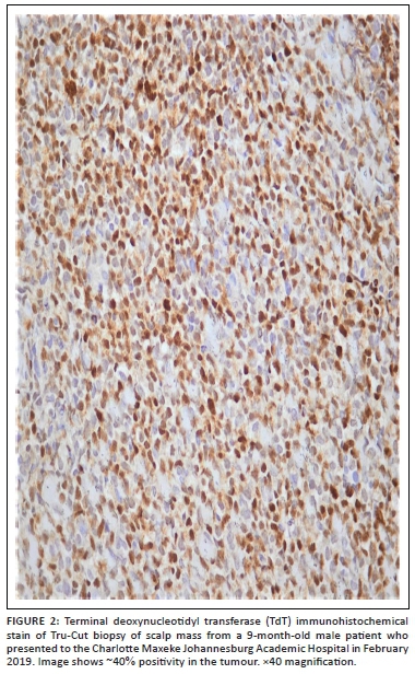 A 9-month-old male patient from Angola presented to the Charlotte Maxeke Johannesburg Academic Hospital, South Africa, in February 2019, with a 3-4-week history of progressive bilateral proptosis and scalp masses. The computed tomography scan identified bilateral occipital and temporal scalp masses with extracranial extension into the orbital cavities and sinuses, and extradural extension into the anterior cranial fossa. There was no hepatosplenomegaly or lymphadenopathy. A fine needle aspiration sample of the soft tissue scalp mass was submitted for flow cytometry, and a Tru-Cut biopsy (manufacturer unknown) for histological assessment at the National Health Laboratory Service. As part of the staging work up, bone marrow aspiration and a trephine biopsy were performed to exclude infiltration of the marrow.