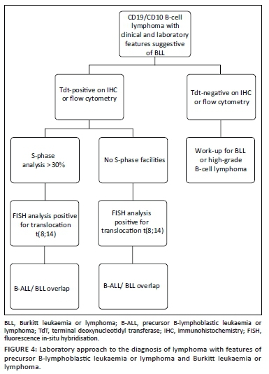 Laboratory work up demonstrated the co-expression of CD19 and CD10 by the tumour, with no expression of CD34 or light chains. Because of this, the expression of TdT was assessed. Terminal deoxynucleotidyl transferase is a DNA polymerase that functions to provide junctional diversity in both B-cell and T-cell receptor genes at the precursor cell stage.8 It is a marker of immaturity and its expression in mature neoplasms such as BLL would be aberrant. Terminal deoxynucleotidyl transferase was found to be positive in ~30% - 40% of the tumour on both the fine needle aspiration and Tru-Cut biopsy specimens. While these results pointed towards a tumour at a precursor cell stage of development, the S-phase fraction analysis found the tumour proliferative activity to be very high. This measurement is performed by flow cytometry and uses DNA content to determine the proportion of cells in each phase of the cell cycle. Studies performed at our centre have shown the S-phase fraction of B-ALL to be characteristically around 10, whereas a fraction of more than 30, as seen in our patient, would be more typical of BLL.6 Comparisons could not be made with the other cases in the literature as S-phase fraction analysis was not reported. The Ki67 index detects a protein associated with cellular proliferation, which is present in all active stages of the cell cycle. Given that the Ki67 index and S-phase analysis measure different aspects of proliferation, these parameters are not always comparable. Notably, the Ki67 index is unhelpful in distinguishing B-ALL and BLL as values of over 95% can be anticipated in both.6 Despite the conflicting laboratory findings in our patient, the high S-phase fraction in the context of extranodal disease prompted the testing for, and confirmation of, the translocation t(8;14). B-cell lymphoma 2 (BCL2) expression is typically seen in acute lymphoblastic leukaemia and the possibility of a double-hit lymphoma was excluded by the presence of TdT.2 S-phase fraction analysis may therefore serve as an early indicator of this disease entity, albeit further investigation of its clinical utility is required. In summary, a combination of diagnostic modalities with evaluation by a multidisciplinary team is required to confirm this rare entity. We propose a laboratory approach to the diagnosis of lymphomas with features of B-ALL and BLL (Figure 4).