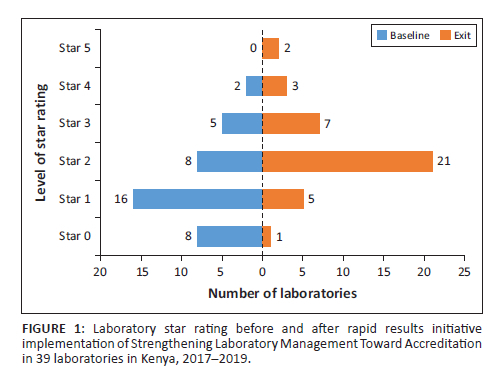 All of the 39 laboratories targeted for RRI process were in urban settings. Of these, 32 (82%) were Ministry of Health-owned, while seven (18%) were affiliated to faith-based organisations (FBOs). All 39 laboratories enrolled in the RRI completed the intensive mentorship sessions including scheduled baseline and exit external audits (Table 1). At baseline audit, most laboratories (24/39, 62%) were below 2 stars, eight (21%) were rated at 2 stars, and only seven (18%) were at ≥ 3 stars. At the exit audit, only six (15%) laboratories scored below 2 stars, 21 (54%) were at 2 stars, and 12 (31%) achieved ≥ 3 stars (Figure 1). Therefore, the number of laboratories that scored ≥ 2 stars rating increased significantly from 15 (38%) at baseline to 33 (85%) at RRI exit (p < 0.001). There was no significant difference in performance between Ministry of Health-owned and FBO-affiliated laboratories, of which 75% and 71% achieved ≥ 2 stars rating. Overall, 34 (87%) laboratories achieved the desired goal of ISO 15189 accreditation in less than two years of the RRI process. This resulted in a 330% increase in the number of ISO-accredited laboratories (from 15 laboratories in June 2017 to 49 laboratories in June 2019) through PEPFAR funding in Kenya.
