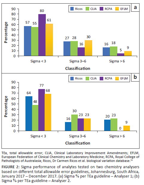 METHODS: A retrospective analysis was performed on 19 general chemistry analytes at Charlotte Maxeke Johannesburg Academic Hospital in South Africa between January 2017 and December 2017. Sigma metrics were calculated on two identical analysers, using internal quality control data and total allowable error guidelines from the Ricos biological variation database and three alternative sources (the Royal College of Pathologists of Australasia, the Clinical Laboratory Improvements Amendment, and the European Federation of Clinical Chemistry and Laboratory Medicine.