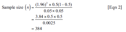 In Equation 1, n is the desired sample size, Z is the standard normal deviation corresponding to a 95% level of confidence. The value obtained from a standard normal distribution is 1.96. p is the prevalence of screening for HIP. Using an assumed prevalence of screening for HIP of 50%: