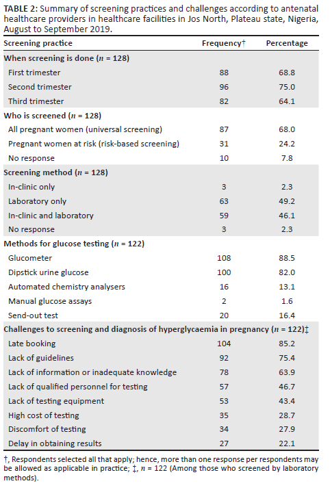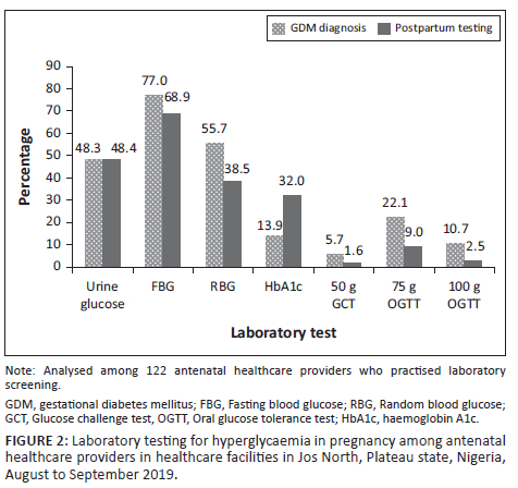 RESULTS: Of the 128 respondents included in the analysis, 59 (46.1%) were male and 69 (53.9%) were female. The mean participant age was 35.7 years (standard deviation: ± 8.5 years). Most (68.0%) screened all pregnant women (universal screening) for gestational diabetes mellitus. Fasting blood glucose (77.0%) and random blood glucose (55.7%) were the most common tests used. Only 27 respondents (22.1%) screened using the 75 g oral glucose tolerance test, and most were doctors, AHPs in faith-based or government institutions, tertiary institutions and facilities with availability of automated glucose analysers (p < 0.05 for all).