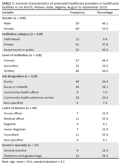 Fifty-nine (46.1%) of the respondents were male and 69 (53.9%) were female healthcare workers (Table 1). The ages of the participants ranged from 21 to 60 years with a mean of 35.6 ± 8.2 years. Most (47.6%, 61/128) of the respondents worked in private health facilities and 44.5% (57/128) provided primary healthcare. Forty-four (34.4%) of the participants were doctors, and obstetrics and gynaecology (76.5%, 13/17) was the most common specialty among doctors with clinical specialties.