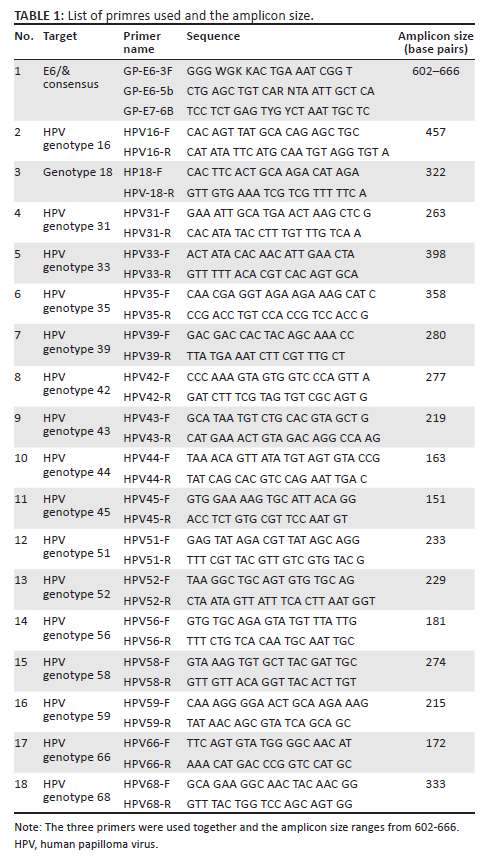 Total DNA was extracted from each sample using a commercially available DNA purification kit (Jena Bioscience, Jena, Germany) per the manufacturer's instruction. The extracted DNA was tested for the presence of the E6/E7 HPV viral gene by PCR using previously described primers (GP E6-3F, GP-E6-5B and GP-E6-6B) and protocol.15 Amplification was achieved using a ABI 9700 GeneAmp thermal cycler (Applied Biosystems®, Waltham, Massachusetts, United States) using the following cycling condition: 5 min at 95 °C for DNA denaturation followed by 65 cycles of 30 s of denaturation at 95 °C, 30 s of annealing at 45 °C, 30 s of elongation at 68 °C and a final elongation of 5 min at 72 °C. The amplified products (602 base pairs - 666 base pairs) were detected using agarose gel electrophoresis. Human papilloma viruses isolates were typed using genotype specific primers targeting the E6/E7 HPV virus gene as previously described15 (Table 1). The primers used could not differentiate between genotypes 6 and 11, thus, it is referred to as genotype 6/11.