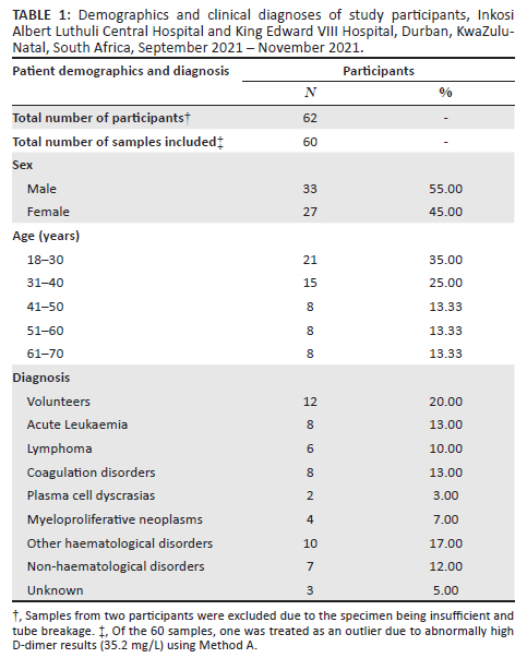 This study was conducted at the Inkosi Albert Luthuli Central Hospital and King Edward VIII Hospital, Durban, KwaZulu-Natal, South Africa, from September 2021 to November 2021. Patients older than 18 years were included in the study. Samples were excluded if there were insufficient blood volumes, or if clots, fibrin strands, or haemolysis were observed.