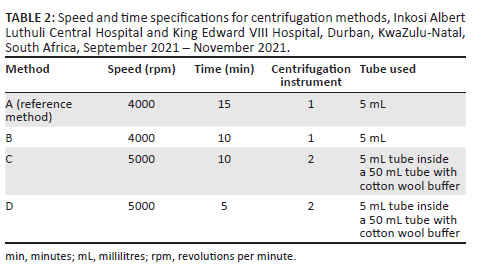 METHODS: Blood samples were collected from volunteers at Inkosi Albert Luthuli Central Hospital and King Edward VIII Hospital, Durban, KwaZulu-Natal, South Africa, from September to November 2021. Samples were centrifuged using Method A, the current standard (4000 rpm/15 min), Method B (4000 rpm/10 min), Method C (5000 rpm/10 min) and Method D (5000 rpm/5 min). Platelet count, prothrombin time, activated partial thromboplastin time, thrombin time (TT), fibrinogen and D-dimer levels were analysed and results from Methods B, C and D compared to reference Method A.