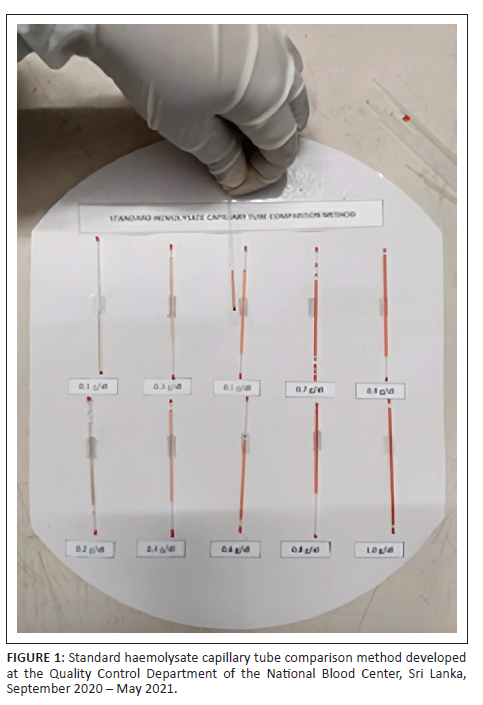 METHODS: A standard haemolysate was prepared using an unexpired whole blood pack of normal haemoglobin concentration. A concentration series from 0.1 g/dL to 1.0 g/dL was prepared by diluting portions of standard haemolysate with saline. The alternative methods, namely visual haemoglobin colour scale, spectrophotometric calibration graph, and standard haemolysate capillary tube comparison, were designed using this concentration series and were used to test red cell concentrates received at the Quality Control Department of the National Blood Center, Sri Lanka, from February 2021 to May 2021.