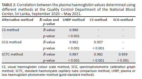 Statistical analyses were performed using IBM® SPSS® (version 20.0) statistical software (2011, IBM Corp., Armonk, New York, United States). The dataset was assumed to be normally distributed, and descriptive statistics such as mean, standard deviation, range, median, variance, and 95% confidence intervals were computed. We also determined the Pearson product-moment correlations between the plasma haemoglobin values obtained using the different methods (LHBP vs CS, LHBP vs SCG, LHBP vs SCTC, CS vs SCG, CS vs SCTC, and SCG vs SCTC). Thereafter, simple linear regression models were built based on the plasma haemoglobin values obtained when measured by the LHBP method (gold standard) (response variable - y-axis) and the alternative methods (explanatory variable - x-axis). Results were considered statistically significant if p was 0.001 or less, with a 95% confidence interval.