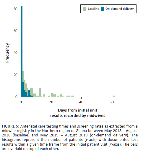 At the antenatal care (ANC) facility reviewed, there were 248 mothers at baseline and 250 in the pilot phase. More mothers were without any documented testing in the ANC facility during the baseline months in 2018 (41 not tested; 207 tested) compared to the corresponding months during the pilot (3 not tested; 247 tested; McNemar test: p < 0.001). In the baseline months, 136 mothers had dates recorded in the midwife register for when their laboratory test results were entered. During the pilot, laboratory test result dates were entered in the register for 115 mothers. The median time from the initial visit to result recording in the ANC register (which may be later than the actual return of results) was significantly shorter during the pilot compared to the baseline months (1 day vs 4 days; two-sample Kolmogorov-Smirnov test: p < 0.001) (Figure 5).