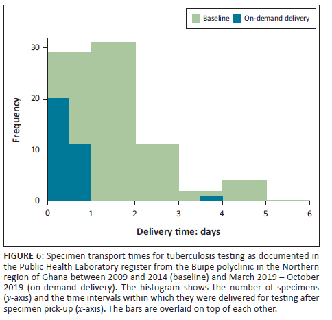 The sustainable development goals demand quality essential healthcare services with universal health coverage, where timeliness is a key component of quality.22,23,24,25 In line with this, the benefits of integrated laboratory networks to healthcare delivery include increased availability, accuracy, and TAT of laboratory testing.26,27 During the pilot, the time from the initial visit to recording of test results in the midwife register at the ANC decreased from 4 days to 1 day, and tuberculosis testing times decreased from 2 to 0 days (same day). As specimen transport systems are a key component of laboratory networks, multiple models have been implemented in different settings, and although the published models are not directly comparable (different metrics and different geographic and disease characteristics), they provide some context to the findings in this study. In a 2013 study in Uganda, a motorcycle hub-and-spoke delivery system for centralised HIV early infant diagnosis led to a reduction in TAT from 1-2 months to 5-10 days.11 The same service led to a TAT reduction for tuberculosis testing from 21 to 3 days.3 In Ethiopia, a private-public partnership involving the Ethiopian Postal Service Enterprise led to HIV early infant diagnosis TATs decreasing from 7 to 2 days in Addis Ababa and from 10 to 5 days in the Amhara region.3,11,12 The current pilot performed comparably, if not better than these.