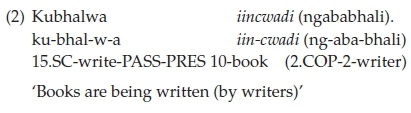 As shown in (1) above, isiXhosa allows for long passives through the use of a copular noun phrase (here, nguJohn) introduced by a copular prefix which serves the same semantic function as the English preposition by and the Afrikaans preposition deur in the context of passive sentences. The form of this prefix (here, ng-) is determined by the class of the noun to which it attaches (Louw & Jubase, 1963, p. 106). Although the isiXhosa copular noun phrase, like the English by-phrase, may occur only postverbally, its exact postverbal position may change in line with discourse factors (Du Plessis & Visser, 1992, p. 84).