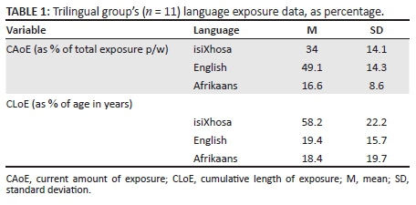 Table 1 presents, in the form of descriptive statistics, the results of the quantification of the trilinguals' exposure data through means of the UBiLEC Excel spreadsheet. For the purposes of the present study, only the variables of CAoE and CLoE are reported on. To enable a comparison of CLoE across children of slightly varying ages (i.e. between 4.00 and 4.99 years), CLoE in years was recalculated to present a percentage portion of the child's age in years. Results revealed that, at the time of testing, the majority of the trilinguals' exposure was, on average, in the medium of English at 49.1%, followed by isiXhosa at 34% and then significantly less Afrikaans at 16.6%. However, by far the majority of the cumulative exposure that these children were exposed to over time took the form of isiXhosa at an average of 58.2%, with English and Afrikaans trailing behind at around 19% each.