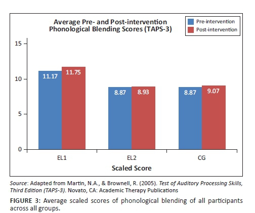 The phonological blending sub-test requires the participant to blend the phonemes produced in isolation to form the required word. Blending tasks are deemed easier than segmentation tasks (Phillips et al., 2008) and the overall high scores of all three groups (compared to those of the segmentation tasks) confirmed this assumption. This test is the only sub-test of the TAPS-3 in which the EL2 group did not improve their scores post-intervention. A disturbing occurrence is that, although there was no significant difference between the scores of the EL1 and the EL2 groups before intervention, a significant difference between these groups was noted after intervention because of improvement of the phonological blending skills of the EL1 learners. Because phonological blending is considered to be easier than phonological segmentation, the gap developing between the EL1 and EL2 groups is a cause for concern.