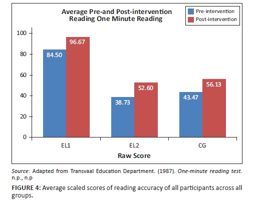 Both the EL2 and CG groups performed significantly below the EL1 group in the pre- and post-intervention assessments. No significant difference between CG and EL2 reading accuracy scores were observed.
