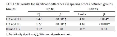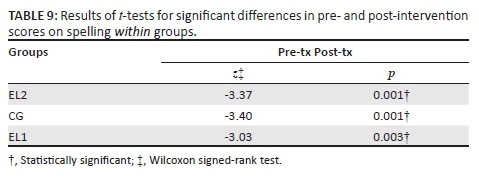 Wilcoxon signed-rank tests confirmed a significant difference in pre- versus post-intervention results for all three groups. All three groups' reading skills could be seen to have improved. However, when analysing the spelling scores, the EL2 group once again shows a significant improvement of 31.5% compared to the 22.6% improvement of the CG and 13.9% improvement of the EL1. Note that this improvement within the EL1 group was also significant. However, even after the intervention, the spelling skills of the EL2 group, as measured by the UCT Spelling Test, are still 44% lower than those of the EL1 group. Table 10 displays the significant differences in spelling scores between groups.