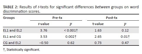 In Tables 1 and 2, the results of the t-tests for significant differences within and between groups on the word discrimination sub-test are provided.