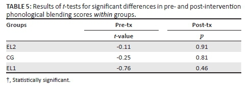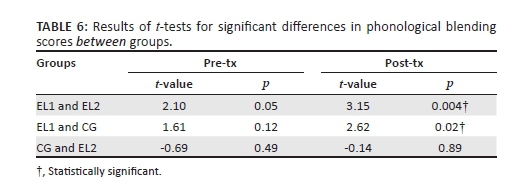 Wilcoxon signed-rank tests confirmed that there was no significant improvement between the pre- and post-intervention scores within any of three groups, including the EL2 group. Therefore, the intervention did not have an effect on phonological blending skills. Table 6 portrays the results of t-tests for significant differences between groups.