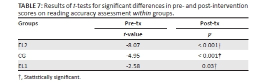 The statistical comparison between pre- and post-intervention scores on the reading assessment within all three groups is provided in Table 7.