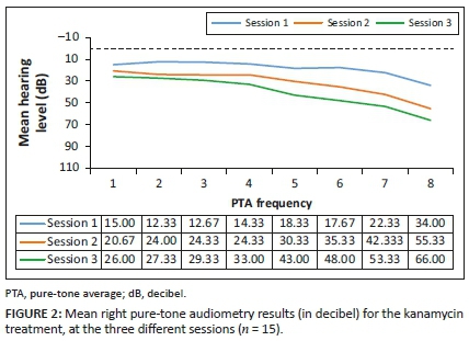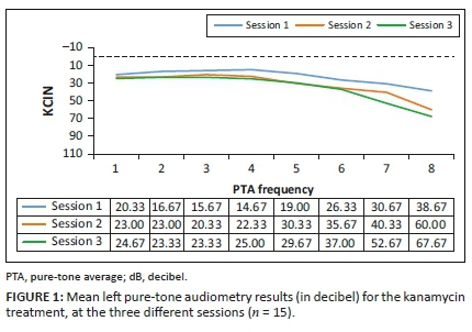 The ANOVA results for the G-KCIN treatment in the left ear indicated statistically significant changes at 8000 Hz, whilst for the right ear, the results indicated statistically significant changes at 4000 Hz, 6000 Hz and 8000 Hz (p < 0.05), with changes progressively worsening as the frequencies increased. The significant changes occurred throughout the three sessions, with the mean pure-tone results increasing from session 1 to session 3. Therefore, hearing status changed at high frequencies for the patients on G-KCIN treatment, with both clinically and statistically significant changes at specified high frequencies.