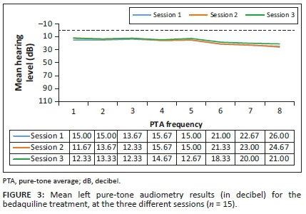 Analysis of the results for the G-BDQ (n = 15) involved comparing the pure-tone threshold results at all three sessions to determine whether any changes occurred during the period when they were receiving BDQ treatment. The pure-tone audiometry results in terms of means are depicted in Figures 3 and 4.