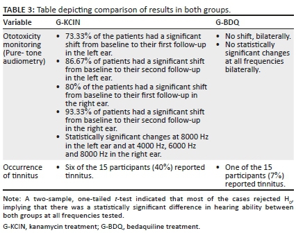 The findings on the higher occurrence of tinnitus in the G-KCIN group compared with the bedaquiline group are consistent with published evidence by Mudd and Glatz (2018), indicating that tinnitus is a common side effect of ototoxic drugs such as G-KCIN. There is no published evidence on tinnitus in patients taking bedaquiline, so the current study findings are possibly the first indication of this otological symptom as a possible side effect of BDQ.