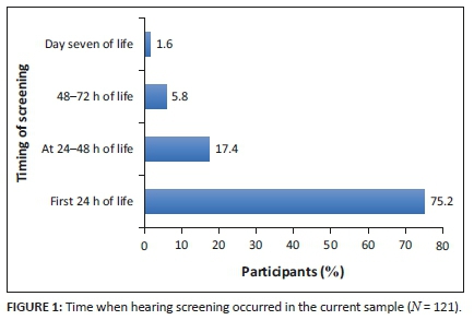 Figure 1 depicts the time when hearing screening was conducted for each neonate included in the study. A large majority, 91 (75%), of the 121 neonates were screened in the first 24 h of life. Only two (1.6%) were screened on day 7 of life. The fact that many of the neonates were screened within the first 24 h is a positive finding as it indicates that hearing screening can be performed prior to discharge from the hospital. This is particularly important in the South African context where mothers and their neonates may be discharged home as early as 6 h post-normal vaginal delivery (NVD), according to the South African Department of Health Guidelines for Maternity Care (DoH, 2015). This, however, is only a positive finding if confounding variables to screening, such as the presence of vernix caseosa and the use of a two-stage approach, are actively addressed prior to the screening being conducted. The mean time taken to screen each neonate was 11 min 17 s, with the longest duration being 40 min, and the shortest screening time being 5 min. The median time taken to screen was 10 min. Technical difficulties with the DPOAE machine, the presence of vernix caseosa and high ambient noise were the main contributors to the prolonged screening time (Bezuidenhout et al., 2018).