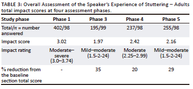 Section 1 (general information) did not improve overall, maintaining a moderate-severe negative impact (see Table 4). This section's score showed initial improvements, a 30% reduction (Phase 3), decreased to a 25% reduction (Phase 4) and 2% by the final assessment (Phase 5). Specifically, initial improvements in general knowledge about stuttering reverted to baseline by 24 months follow-up (see Table 3).