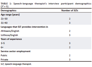 Seven SLTs were initially contacted and five SLTs provided written consent to participate in the study. The mean age of SLT participants was 32 years. Speech-language therapists were equally represented on key sociodemographic characteristics (see Table 1). All SLTs were female.