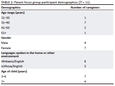 A total of 40 consent letters were sent out to families. Thirteen caregivers provided consent and 11 took part in the focus groups as 2 caregivers were unable to attend on the day the focus group was held. Table 2 provides an overview of the caregiver's sociodemographic characteristics. The mean age of the children was 5 years and the mean age of caregivers was 38 years. The children's diagnoses included autism spectrum disorder (ASD), global developmental delay (GDD), Williams syndrome and Prader-Willi syndrome.