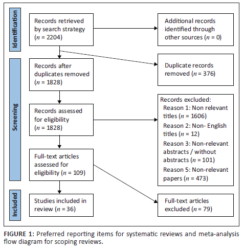 Results of the search strategy and study selection process are presented in a preferred reporting items for systematic reviews and meta-analyses extension for scoping reviews (PRISMA-ScR) (Moher et al., 2009) diagrammatic flow chart (Figure 1). The initial search yielded 2204 articles, and 376 duplicates were removed. No new articles were found through the review of the reference lists. Then, 1828 article titles and abstracts were screened for relevance and 1719 articles were excluded for the following reasons: different population focus, did not relate to COVID-19 and different diagnosis focus. The full texts of 109 articles were then screened for eligibility, and 79 were excluded leaving 36 articles included in the final review.