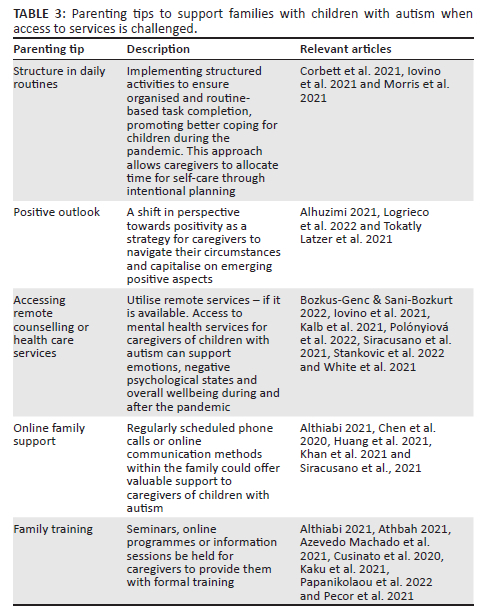 Caregivers grappling with mental health challenges encountered obstacles in leveraging technological means to access support from friends, family and health care services. Caregivers' mental health struggles hindered their use of technology to seek assistance, leading to reduced wellbeing as daily routines turned monotonous (Huang et al., 2021; Yılmaz et al., 2021). Proactive support and coping strategies are imperative to address these challenges. Specific resources, research and guidelines must be tailored to caregivers of children with autism. With the acknowledged risk of skill regression, caregiver burden escalated worldwide (Corbett et al., 2021; White et al., 2021). This burden emanated from grappling with structural changes, from managing behavioural issues to accommodating shifting routines and addressing service limitations while fulfilling daily tasks. Therefore, it is important to consider the ways in which caregivers should continue to be supported through access to resources, utilisation of online supportive services such as through social media platforms or online support groups, psychological and therapeutic support, and encouraging self-care.