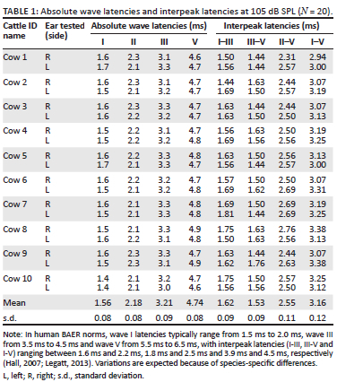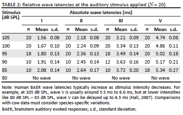 RESULTS: The cows exhibited auditory thresholds at 90 dB SPL (55 dB nHL). Detailed wave and interpeak latencies were recorded at intensities from 85 to 105 dB SPL. At 90 dB SPL, the average latency for wave V was 5.17 ms, marking the auditory threshold for Holstein cows